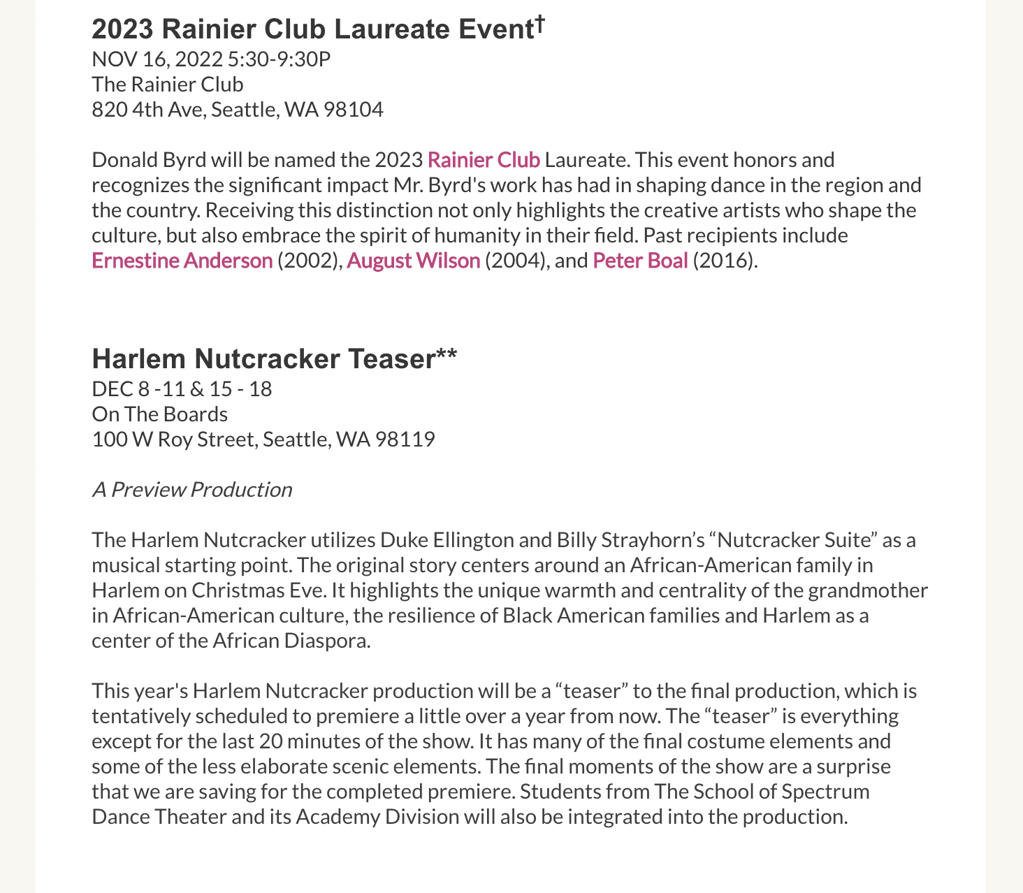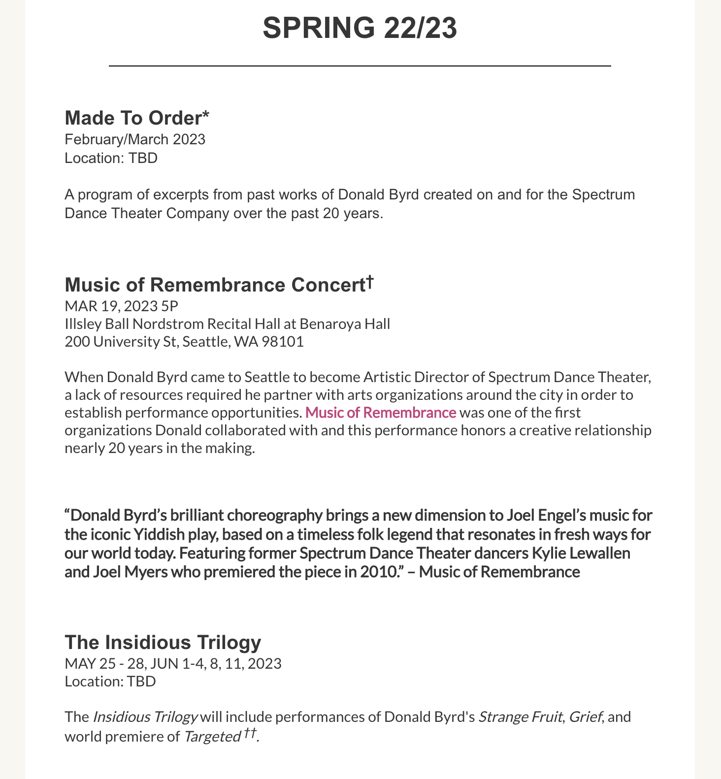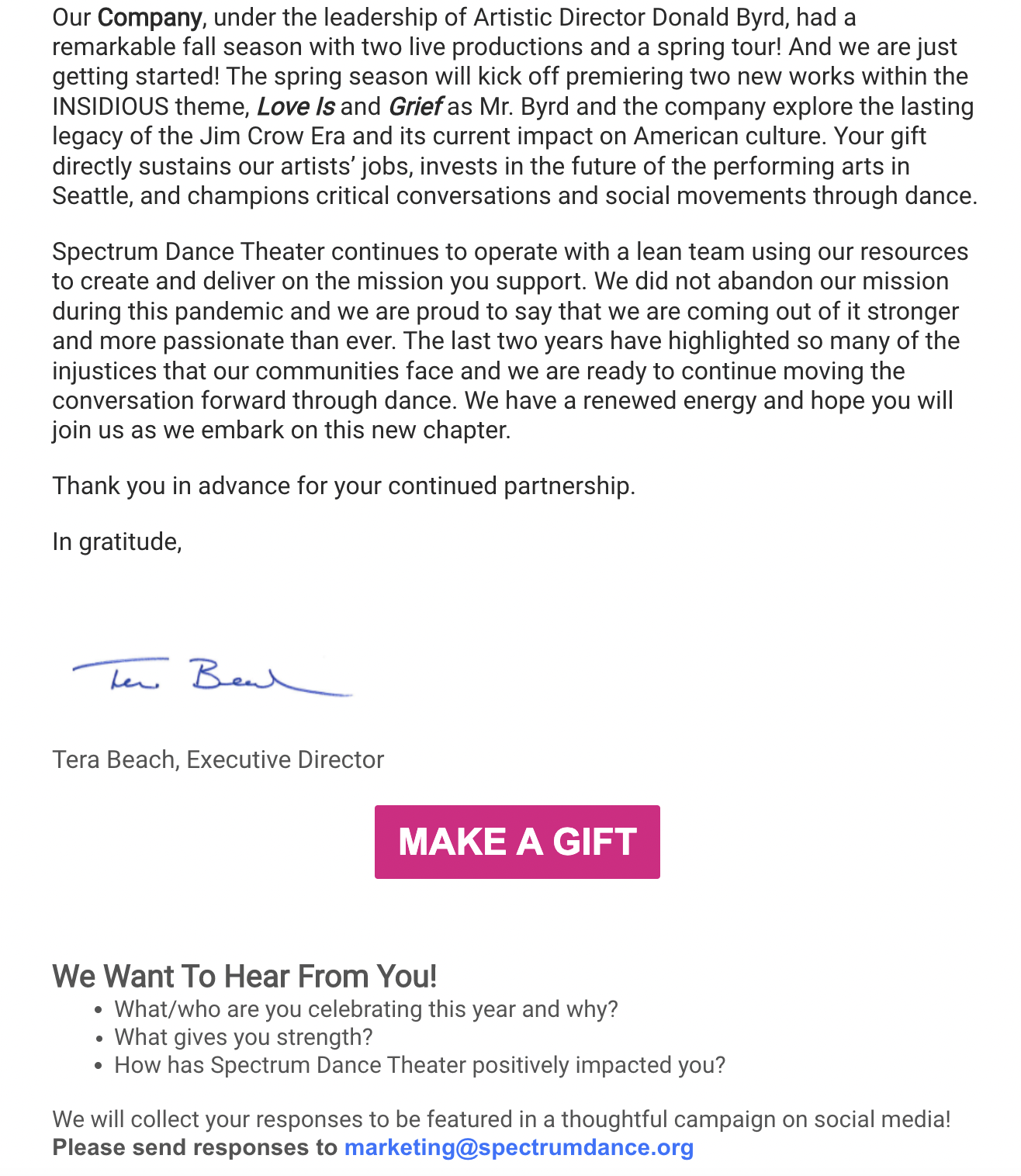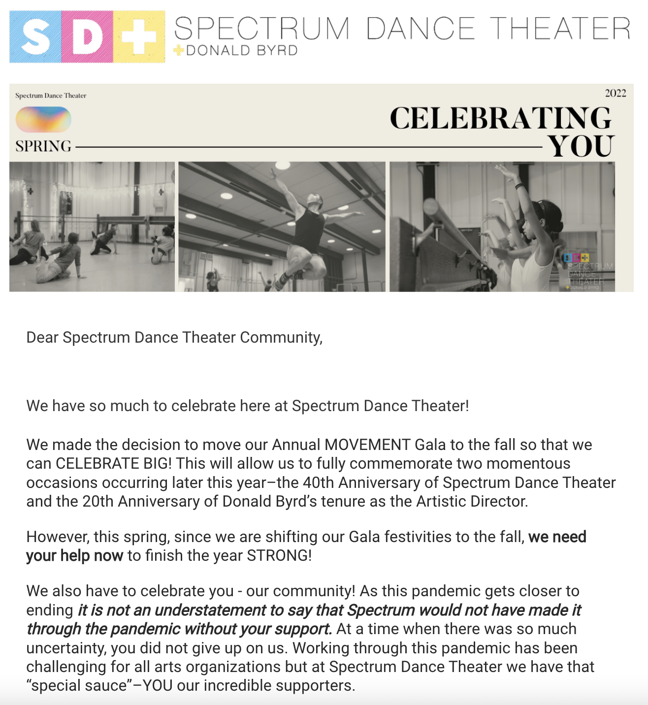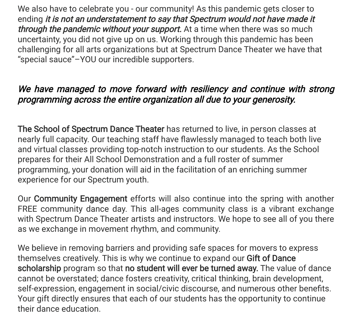 Press ReleaseListed below is an example of the most recent press release I crated for the 22/23 performance season.View PDF 22/23 Press Release P.1| Role: Writer 22/23 Press Release P.2 | Role: Writer 22/23 Press Release P.3 | Role: Writer 22/23 Press Release P.4 | Role: Writer 22/23 Press Release P.5 | Role: Writer Slide 1 Slide 1 (current slide) Slide 2 Slide 2 (current slide) Slide 3 Slide 3 (current slide) Slide 4 Slide 4 (current slide) Slide 5 Slide 5 (current slide) Spring AppealThe Spring Appeal letter linked below was sent to patrons and supporters to encourage community engagement and donations.View PDF Spring Appeal P.1 | Role: Writer, Editor Spring Appeal P.2 | Role: Writer, Editor Spring Appeal P.3 | Role: Writer, Editor Slide 1 Slide 1 (current slide) Slide 2 Slide 2 (current slide) Slide 3 Slide 3 (current slide) Monthly NewsletterEach month we send a newsletter to our patrons to keep them up to date on all of our events, classes, and company performances.View PDF Role: Writer Role: Writer, Graphic Designer Slide 1 Slide 1 (current slide) Slide 2 Slide 2 (current slide)